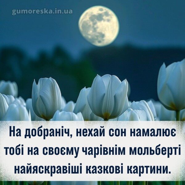 Вечір – це час мрій. Мало хто з нас у цей час не надається приємним спогадам чи мріям. Щоб настрій перед сном був незмінно добрим, емоції – позитивними, а ніч пройшла спокійно, допоможуть гарні картинки на добраніч, солодких снів картинки 2025 українською мовою та побажанням в прозі. Їх можна просто переглянути, скачати на свій комп’ютер, смартфон або планшет, поділитися посиланням у соціальній мережі або месенджери.
