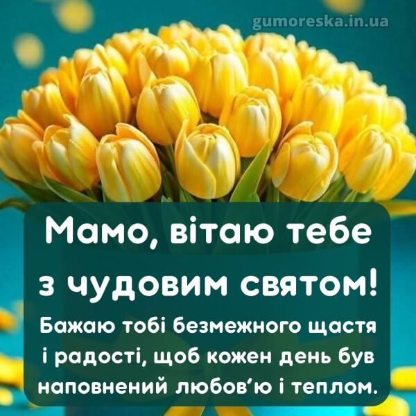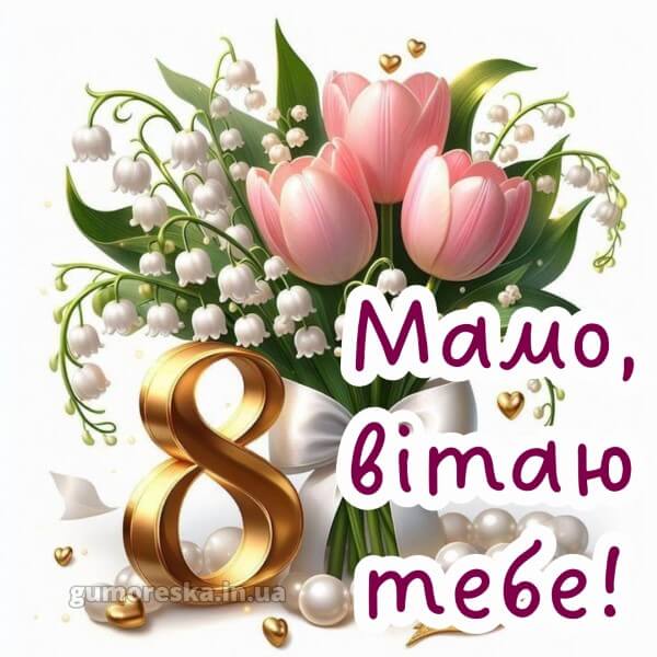 Готові привітання з 8 березня мамі 2025 виглядають щиріше і яскравіше, адже вони йдуть прямо від серця. Особлива яскрава картинка тішить не тільки погляд, але і душу. Ваші матусі, сестри, подруги, колеги оцінять і запам’ятають зворушливі побажання, в яких сенс і увага залишаються на першому місці. Цікаві та зворушливі привітання з 8 березня мамі 2025 українською зібрані для вас на цій сторінці. Ці гарні та красиві поздоровлення підійдуть для привітання жінки будь-якого віку: 25, 30, 35, 40, 43, 45, 49, 50, 51, 55, 57, 60, 62, 65, 70, 75, 80 років. Обирайте та надсилайте їх представницям прекрасної половини людства безкоштовно.
